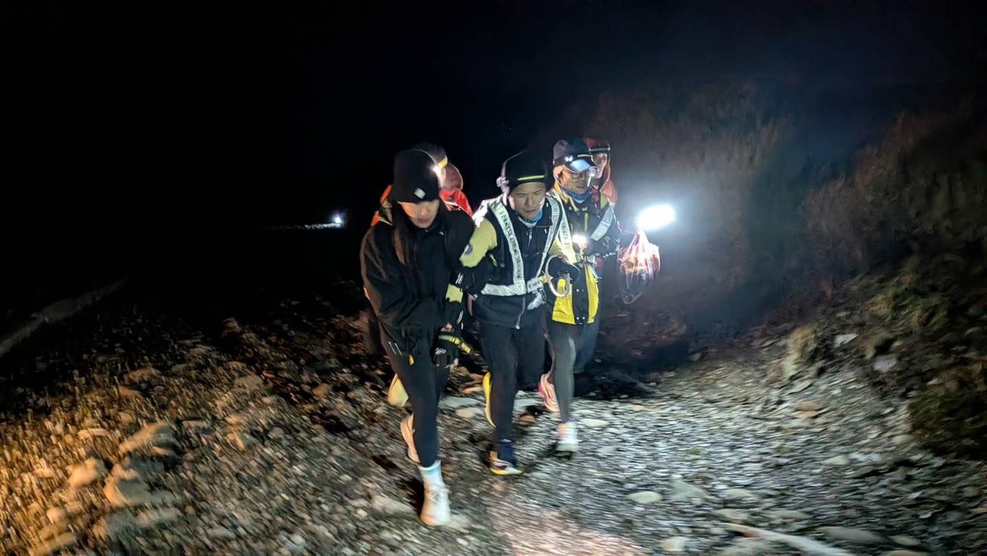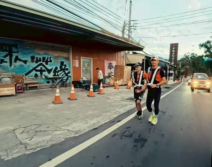 興哥在下午三點半抵達T2轉換區時,進度比預期快了一些,負責馬拉松段的陪跑員小廣與 Lobo 採取機動交替,隨時為興哥調整補給與衣物。當賽事進入霧社台14甲的路上,沿途幾乎都是伸手不見五指的黑暗,僅有微弱的頭燈指引方向,開始陡升的路面伴隨著不時呼嘯而過的大貨車,都讓二位陪跑員繃緊了神經,戰戰兢兢的陪同興哥邁步向前,還好二位陪跑員:Lobo 和小廣,都是身經百戰的全馬好手,也是興哥在馬場上的好搭檔。隨著高度上升到3,000公尺的昆陽,越來越稀薄的空氣和低溫,也讓興哥的身體開始有高山反應:體力耗盡、肚子脹到吃不下補給。