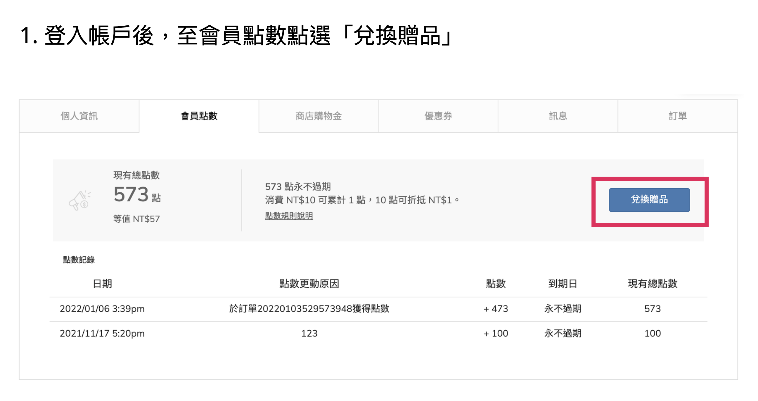 您所累積的會員點數可於官網「兌換贈品」。