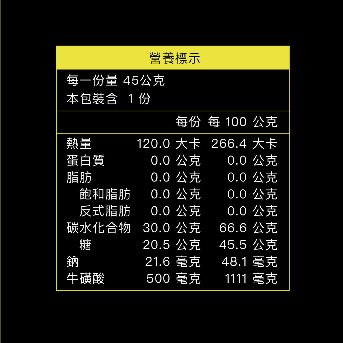5. 完美熱量/重量比,每包45公克淨重,給你完整30公克碳水化合物,120大卡熱量